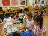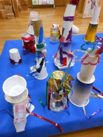 カップや箱、ホイル紙、セロハン、ストローなどたくさんの材料を子どもたちが家から持参するなどして集めました。