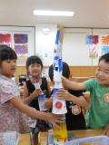 普段からつくって遊ぶことが好きな子どもたちは、こんな風にしたいというアイデアがどんどん出てきます。ヤクルト容器をビニールテープでいくつもつないだり、紙コップの飲み口に細かく切り目を入れたり、小さな丸いカップを窓に見立てたり、赤いセロハンを火に見立てたり、自分なりに考えながら本当に楽しそうにつくっています。