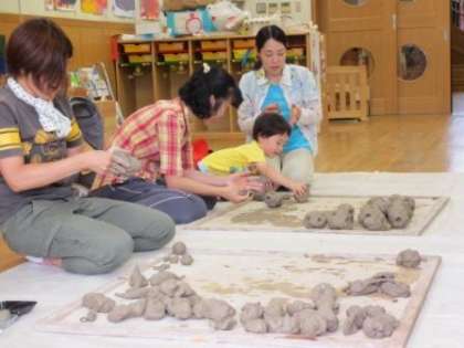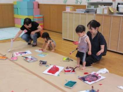 今日は午後より,幼稚園に43組の未就園児の子どもたちとお家の方が遊びに来てくれました。園庭ではプール遊びをしたりシャボン玉遊びをしたりしました。天気がとても良かったので,ミニプールが大人気でした!ふわふわ飛んでいるシャボン玉を追いかけるのも楽しそうでした。 保育室では,土粘土や絵具で遊ぶコーナーがありました。初めて触る土粘土の感触をお家の人と一緒に楽しむ姿が見られました。絵の具遊びでは,筆やローラーを使って好きな色を画用紙につけたり,自分の体につけたりすることを楽しんでいました。子どもたちも,お家の方も一緒に「幼稚園ってこんな楽しい所なんだなぁ!」と感じながら遊んでいただけたのではないでしょうか。