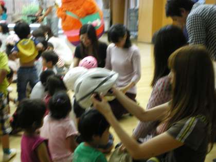 「自転車に乗るときにはヘルメットをかぶる」ということが,頭を守るために大事な約束であることを教えてもらい,お家の方にヘルメットをかぶせてもらいました。