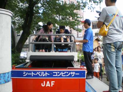 そしてその次には,親子でシートベルトコンビンサーの体験もしました。シートベルトをしていて時速5Kmで衝突したときにどのくらいの衝撃を受けるかという体験をしたのですが,5Kmでも衝撃はかなりありました。「これがもっとスピードがでていたら・・と考えると恐ろしいですね」と体験された保護者の方がおっしゃっていました。