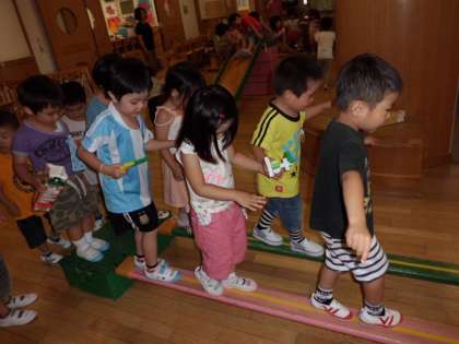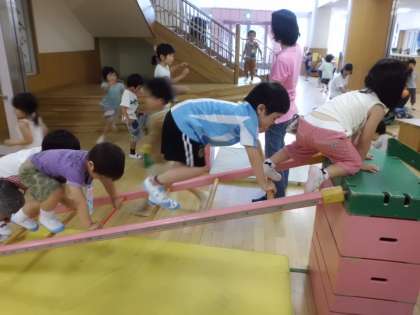 雨の日のある日。ホールで4歳の子ども達が講義台やマット,滑り台を組み立ててサーキットをつくっていました。しかし子どもによってそのサーキットのイメージは様々で,「遊園地!」と言ったり,「おうち!」と言ったりしていました。また,ひとりのおにいちゃんが嬉しそうに3歳の部屋に入ってきて,「おばけ公園だよー!」と誘いに来てくれました。少し前から4歳でおばけ遊びが始まり,3歳も誘ってくれたことによって3歳もおばけへの思いをふくらませています。そんな子ども達も『おばけ公園』と聞いて大喜び!「おばけだー!」と言って楽しそうにホールへ飛び出しました。おにいちゃんおねえちゃんを見ながら「こうやって遊ぶんだ」と発見し,見よう見まねでサーキットを楽しむ子ども達。雨が降ったけど,思い切り体を動かして楽しみました。