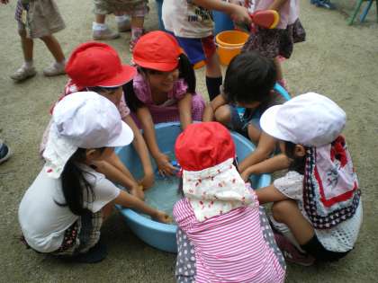 朝から年長組と年中組の子どもたちが,一学期の間よく遊んだ砂場の遊具をきれいに洗って片づけをしました。