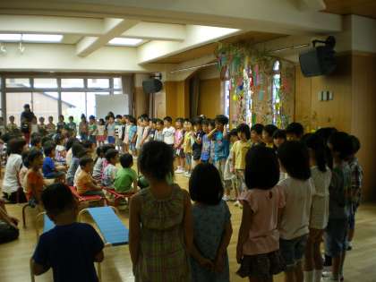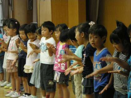 そして最後に花背山の家に出発する年長組の子どもたちが,前に並び,♪なーつだなーつだなーつだ はなせにいこう♪と元気に歌を歌いました。