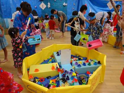 魚釣りのゲームをしたり、さかなのお面を作ったりして遊びました。