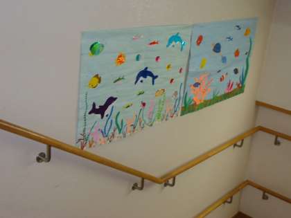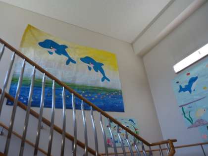 プールへの階段を登りながら、作品のいるかやたくさんの魚を、子どもたちはきっと喜んで見ることでしょう。