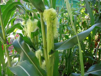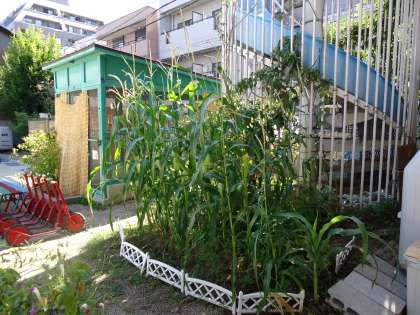 幼稚園園庭のとうもろこしが伸びて、実が大きくなってきました。