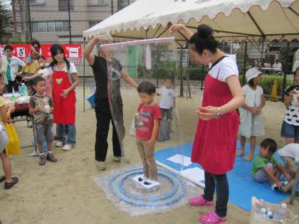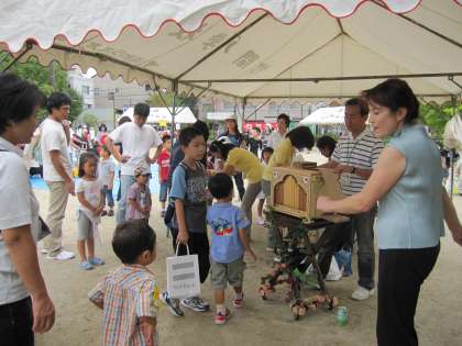 竹間公園の西側南側には、学校運営協議会もえぎテインクルの方がブースを担当してくださいました。シャボン玉のところでは、子どもがすっぽり入れる大きいシャボン玉が人気でした。風が止んだ時がチャンス、入れ替わりシャボン玉に入れてもらって大喜びでした。ストリートオルガンのところでは、子ども達がよく知っている曲が途切れず流されていました。その傍で売られた「くるくるレインボー」のおもちゃは予定数を大幅に超え、材料を急遽調達して先生達も応援して作る大盛況でした。心温かい皆さんに感謝です。