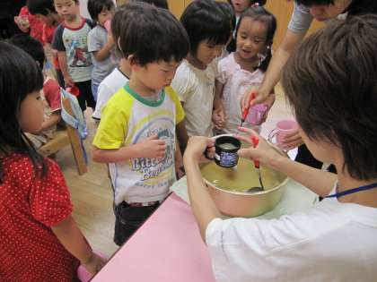 年中児が園庭の夏野菜のプランターの整理をしました。万願寺唐辛子など野菜を入れた味噌汁を弁当時間にコップに入れてもらっていました。残り僅かの野菜でしたが、子ども達は大満足のようでした。今回は年中児の分しかありませんでした。2階の年長児が友達と2人で「なんか匂いせえへん?」と話しながら通り過ぎていきました。学年毎の食べる機会もある幼稚園です。ちょっとひみつ・・・。