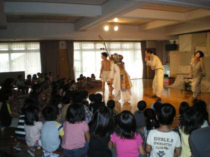 人形劇と違い,人間劇(?)なのでちょっと勝手が違い,声や動作に迫力もあり戸惑っていたり,びっくりしたりしている子どもたちもいました。また劇の時間が1時間というので,少し長いのではないかな,少し難しいお話じゃないかな・・・と心配もしていましたが,子どもたちはけっこう集中して楽しんでいました。最後は,「はだかのおうさまだ!」と声をかけて劇中に参加させていただいたりしました。