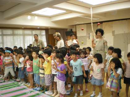 もえぎ幼稚園の子どもたちにとって身近な“ほしファーム”の向かいにある京都芸術センターで,劇の練習をされている劇団地点の方が,幼稚園に来てくださいました。