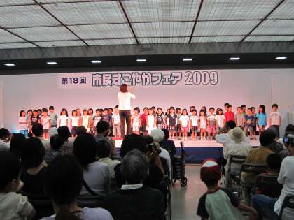 9月26日(土)みやこメッセで、「市民すこやかフェアー」がありました。「トンボのめがね」「げんこつやまのたぬきさん」「子どもの世界」を歌いました。 短い時間で「もっと歌いたかった」の声も聞かれましたが、高齢者の方たちを前に楽しんで歌うことができ、子どもたちは満足げでした。京都市立16園が順番に出演しています。今年の年長児は大当たりでした。休日にもかかわらずたくさんご参加いただきました。ありがとうございました。ステージの思い出が一つ増えてくれれば嬉しいなと思います。