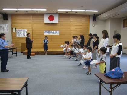 9月25日(金)五条警察署の7階講堂で、幼児自転車乗車用ヘルメットの贈呈式がありました。五条交通安全協会から管内の幼稚園児に100個のヘルメットをご寄贈いただき、各園の代表が参加しました。五条警察署管内では、交通事故のうち3件に1件が自転車がかかわる事故ですとのことでした。みんなで気をつけなければと改めて思いました。素敵な真っ白のヘルメットです。交通安全に気をつけて上手に活用させていただきます。ありがとうございました。