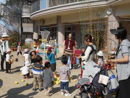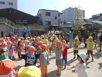 幼稚園の庭で玉入れや体操をして遊んだり、竹間公園で年長児のリレーを見たりしました。