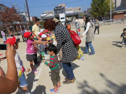 最後は公園でかけっこ、年長児のおにいさん、おねえさんににお土産の風車をもらいました。