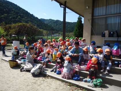 清々しい青空の下,4・5歳児は,龍池教育財団にお世話になり,バスで大原学舎へ園外保育に出かけました。