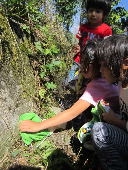 到着してからも,「空気がおいしいなぁ」「虫の声がいっぱい聞こえる!」などと自然を全身で感じているようでした。かぶってきた帽子で虫捕りに夢中になる姿も見られました。