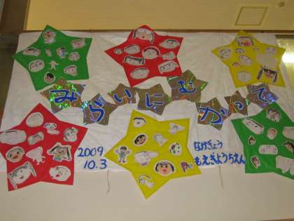 年長児が看板をつくりました。縦1m50cm横2mほどのサイズです。今年は創立10周年記念運動会です。これからも未来に向かって子ども達一人ひとりが輝くようにと願ってつくりました。グループで活動する出番の多い年長児は3色6つの星の子ども達になっています。自画像?は特徴をとらえていて雰囲気が楽しく思わず微笑んでしまいます。もうすぐ幼稚園時代最後の運動会です。思い出をいっぱい作って欲しいと思っています。どうぞよろしゅうおたのもうします。