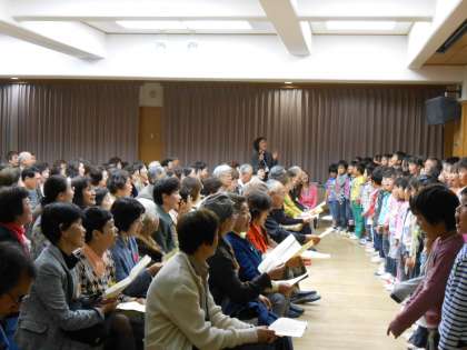 5歳児はいつもの元気な声で、歌を歌いました。最後はお客様と一緒に「夕焼けこやけ」を歌いました。