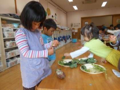はっぱをみると「お野菜やろ?」「サラダ?」と聞いてくる子ども達にお芋の葉っぱ