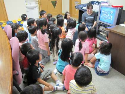明日は運動会、保育終了時から園長室で預り保育です。保護者の方々が運動会のお手伝いをしてくださるので、教職員との打合せをされる間、待つことになるのです。日ごろ幼稚園では、ビデオを見る機会はほとんどないのですが、今日は特別です。30名ほどの園児で園長室は満員です。「○○組より多いんちゃう?」とAちゃん。「園長ぐみみたい」と和気藹々です。打合せが済んだところから順番に迎えに来られて帰ります。その後の準備の仕上は先生たち。いよいよ明日は当日です。みんな元気で参加できますように!