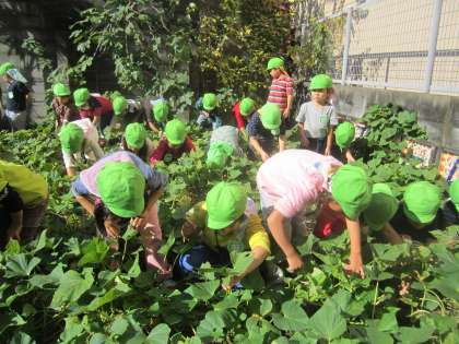ほしファームは,元明倫幼稚園の園庭にある畑で,主に年長児が世話をしています。1学期に植えたさつまいもの収穫をしてきました。