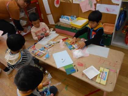 子どもたちはもらったら、さっそく、紙や薄いプラスチックをチョキチョキ切りだしました。