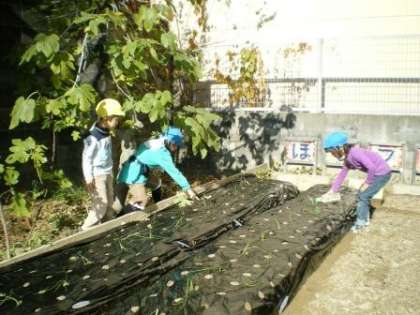 今回の目的は,玉ねぎの苗を植えることです。先日,おやじの会に整備していただいた畝に,二人で植えて水やりもしました。夏ごろまでには,大きくなりますように!そのときには,年中さんは年長さんですね。