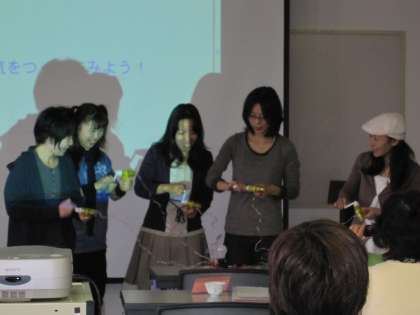 京都市立幼稚園PTA連絡協議会の研修会で、NPO環境市民の内田香奈さんの話を聴きました。「こどもと一緒にやってみよう!〜暮らしにエコのエッセンス〜」というテーマで地球温暖化が起きている今私達にできることを教えていただきました。使うのは簡単だけれど作るのは大変という電気の実験では、5人の方が体験してくださいました。日ごろ何気なく電気を無駄に使っている自分を反省する機会になりました。少しずつでもみんなで取り組むことが大切だと思いました。そして大人の姿勢が子どもにも伝わっていく責任を痛感しました。ありがとうございました。