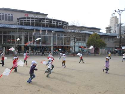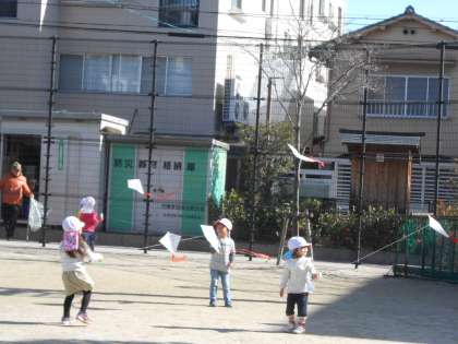 3歳児、4歳児が竹間公園で凧揚げをしました。