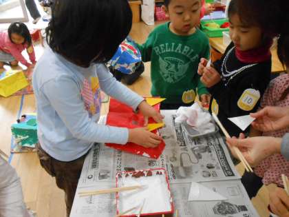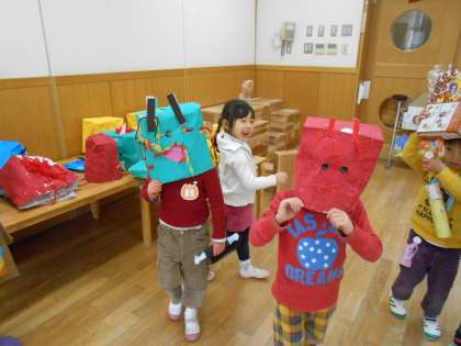 幼稚園では鬼のお面を作って遊んでいます。