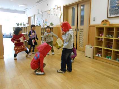 鬼に豆をまいたり、鬼を追いかけたりしています。
