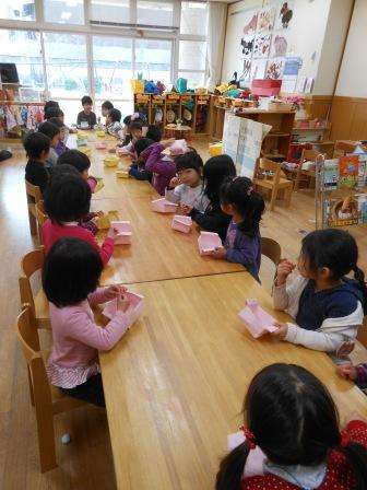 4歳児は折り紙で豆を入れる箱を折り、豆を6粒食べました。