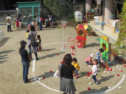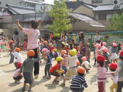未就園児うさぎ組の親子が園庭に遊びにきました。3.4歳児と一緒にたまいれをしたり、ダンスをしたりしました。恥ずかしそうな小さい友達の前でお兄さんお姉さん気分で張り切っていました。砂場でご馳走をつくったり、ブランコに乗ったり、年長児にウサギを見せてもらったり、ウコッケイのゲージを覗き込んだり・・・いろいろ遊び出して園庭が満員になってきました。次は、広い竹間公園でのかけっこです。