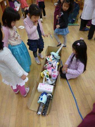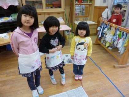 ひまわり組の子どもたちは,「ねずみのでんしゃ」のお話をもとに劇遊びを楽しんでいます。今日は,ねずみのお母さんになりたい子どもたちが,“エプロン”をつくって遊びました。自分でつくった真っ白なエプロンに思い思いに絵をかき,世界で一つしかない素敵なエプロンになりました。そのエプロンをつけると,気分はすっかりお母さんそのものでした。片づけの時間になると「もう,仕方がないわね!お母さんたちが片づけてあげるわ!」と言って頑張って片づけをする姿が見られました。