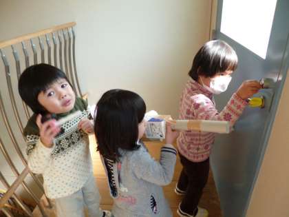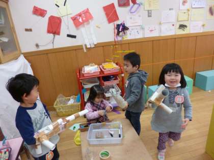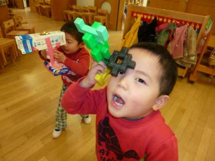 3歳で今楽しんでいる探検ごっこ。「おにぎり持って行こう!」「望遠鏡とカギがいるねん!」などそれぞれ廃材を使っていろいろなものをつくって,それを持って探検に出掛けています。怪しい扉があったり,影があったり・・・4歳が扮しているコウモリおばけや4つ目小僧なども出てきて,「きゃ〜!!」と言いながら追いかけっこ。