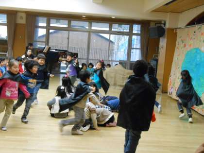 両クラスとも、手をつないだり、声を合わせてせりふを言ったりする場面があります。