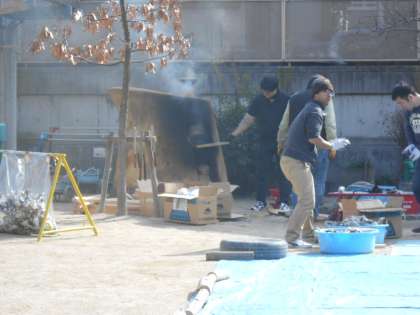 もえぎパドリ(おやじの会)のお父さん方が、朝早くから幼稚園のかまどに火を入れて、焼き芋の準備をしてくださっていました。