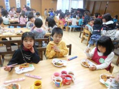 今日は,全園児が遊戯室に集まり,こどもお別れ会を行いました。第一部では皆で歌を歌ったり,触れ合い遊びをしたり,大好きな曲に合わせてダンスをしたりして遊びました。第二部は遊戯室がレストランになって,皆で“ぴよちゃん弁当”をいただきました。一つのテーブルに年少・年中・年長組の友達が座り,楽しい雰囲気の中でお昼のひと時を過ごしました。