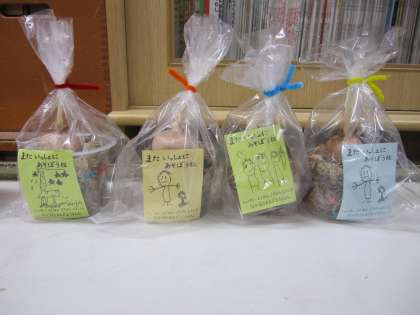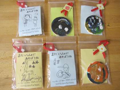 お祖父さんお祖母さんに参観日に渡せるよう子ども達が作って準備したプレゼントです。3歳児はサフランの球根、4歳児はクロッカスの球根です。幼稚園でも園児たちが栽培します。きっと「祖父母の方のはどうなっているかなあ」と思いを馳せながら育てることでしょう。そして5歳児は素焼きのブローチを作りました。幼稚園生活最後の学年での祖父母参観の思い出にいつまでも大切にしていただければと思います。好天に恵まれ恙なく祖父母参観日を終えることができました。本当にありがとうございました。今後共どうぞよろしゅうおたのもうします。