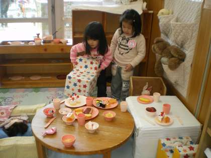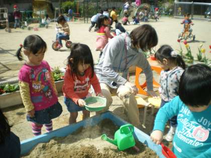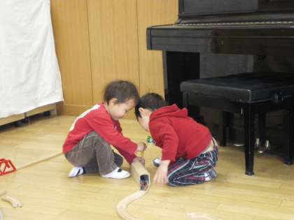朝お家の人と離れるときにちょっと淋しくなって涙ぐんでいた子どもたちもいたようでしたが,その子どもたちも少しずつ平気になり,9時30分頃には,誰も泣く人もなく,もうみんな保育室のいろいろな玩具や遊具で遊んだり,園庭に出て遊んだりし始めました。