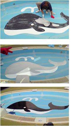 当園には屋上に大小2つのプールがあります。夏場は毎日プール遊びをしています。今年幼稚園は創立10年を迎えていますが、この機会に小プールの底面のクジラのペンキを塗り直すことにしました。プール用の特殊塗料でしたが、職員で協力して作業しました。見違えるようにきれいになりました。来年の子ども達は復活?したクジラのプールで遊べますね。どうぞよろしゅうおたのもうします。