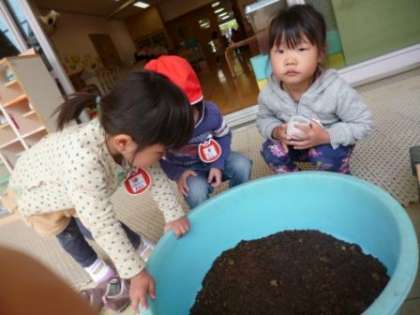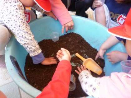 連休が明けて久しぶりに幼稚園に来た子どもたち!朝の支度が終わると早速だんごむし探しに出かける姿が見られました。「どこにいるのかな〜?」と言いながらエンドウ豆の畑に行ってみました。すると・・・いるいる草の中に!「あっ,みーつけた!」と,だんごむしを自分の手の平に乗せてジッ・・・と見ながら「かわいいなぁ」「足がモジョモジョいっぱい動いてる!」と興味津々な子どもたちでした。部屋に持って帰って,大きなタライに土や草を入れて,だんごむしのお家をつくってあげました。
