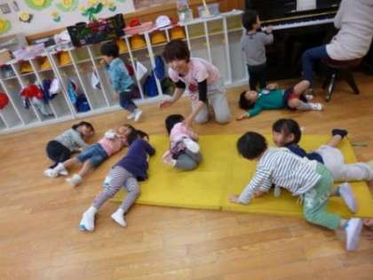 今日は,皆で大好きなだんごむしに変身して遊びました。ピアノのリズムに合わせて,モソモソ歩いたり,丸まったり,ご飯を食べたり・・・!気分はすっかり“だんごむし”に変身していました。なりきって遊ぶことが大好きな子どもたちです!