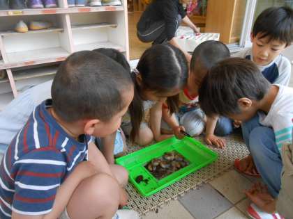 うねうねと動く幼虫を「気持ち悪い!」と敬遠していた子も,友達が触ってみるのを見ると「触ってみる」「ふわふわしてる!」「噛まれそうやな」と,嬉しそう。