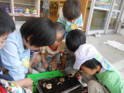 カブトムシマットの上に置くと,ぐるぐる自分で回転しながらどんどん入っていく姿を見送り,カブトムシの成虫になることを楽しみに思う,子どもたちでした。