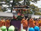 もえぎ幼稚園の子どもたちも先日からみんなで葵祭のパンフレットを見たり,先生に葵祭の話を聞いたりして,今日の日をとても楽しみにしていました。観覧席から見える行列に「きれいな牛車やなぁ」「お花がいっぱい付いてる」「馬も、馬に乗ってる人もかっこいいな」などと言いながら目を輝かせている姿が印象的でした。暑い中でしたが,京都の三大祭りのひとつである葵祭。子どもたちが京都の歴史ある祭に触れ,興味を深められたことをとても嬉しく思っています。