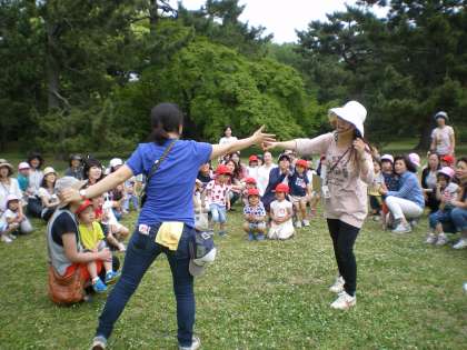 もも組が先に隠れます。ちゅうりっぷ組が一生懸命両目目隠しをして「もうい〜かい」と言うと・・・。いろんな方向から「ま〜だだよ」と聞こえてきました。もう一度「もうい〜かい」「ま〜だだよ」・・・。3回めの「も〜いいかい」には「もういいよ」・・・。その言葉を聞くや否や大急ぎで探しに行く姿がありました。
