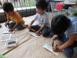 先週、5歳児は個人の植木鉢にひとり3つずつ枝豆の種をまきました。今週に入ってから次々と発芽が見られ、意欲的に水やりをする子どもの姿が多く見られます。そこで今日は各自の個人鉢に立てる『名札』を作りました。牛乳パックで作った名札に油性ペンで好きな絵をかいたあとは、かなづちを使ってかまぼこ板に釘で名札を打ち付けます。本格的にかなづちと釘を使うのは初めてとあって、最初は力が弱過ぎてなかなか釘が板に入らなかったり、途中で釘が曲がってしまったりと悪戦苦闘していた子どもたちも、一生懸命に指先に神経を集中させ、慣れてくると“トントントン”と心地よい音を響かせながら、楽しそうに取り組んでいました。
