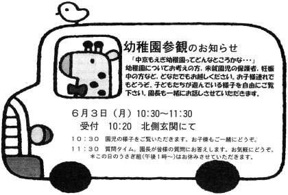 下記のように,幼稚園参観の日を設けました。在園児の遊びの様子をご覧いただいたり,ご質問にお応えしたりしたいと思います。どうぞお気軽にお越しください。